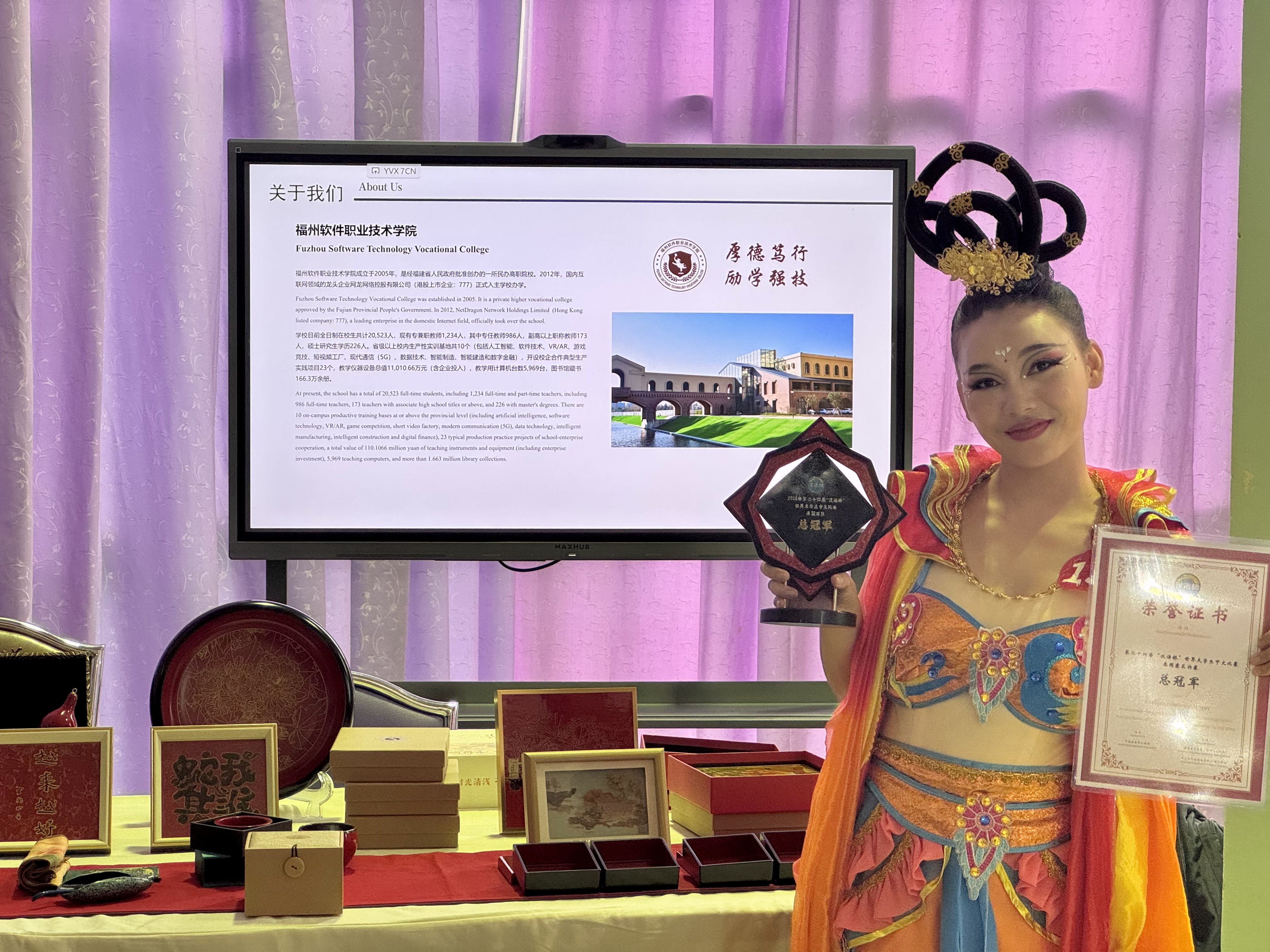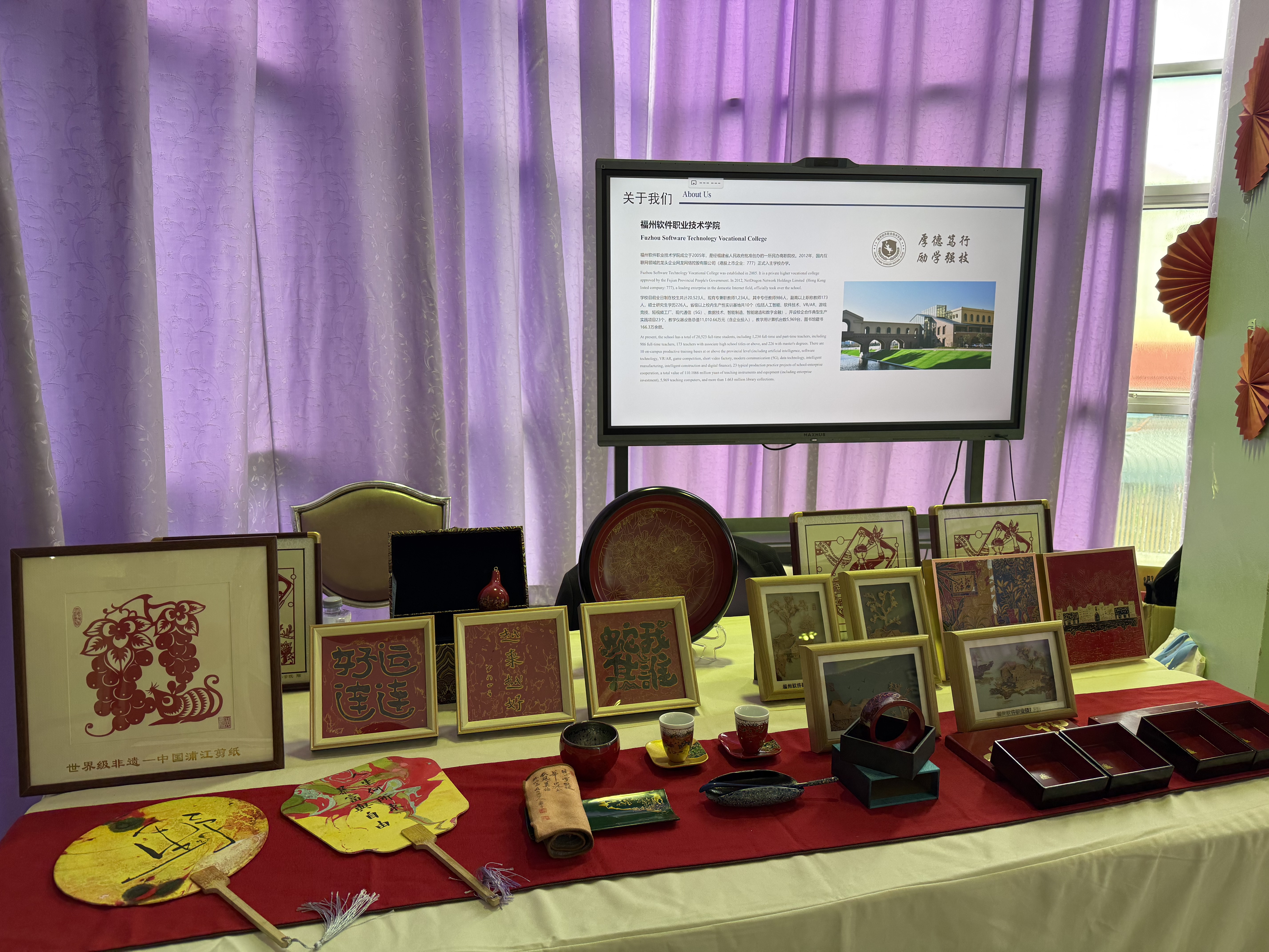 在此热烈氛围中,福州软件职业技术学院携精心打造的非物质文化遗产作品在展区盛大亮相,生动诠释大赛"追梦中文,不负韶华"的主题,向泰国教育文化界及公众展示了中华传统工艺的深厚底蕴与我校在非遗传承教育上的显著成就。