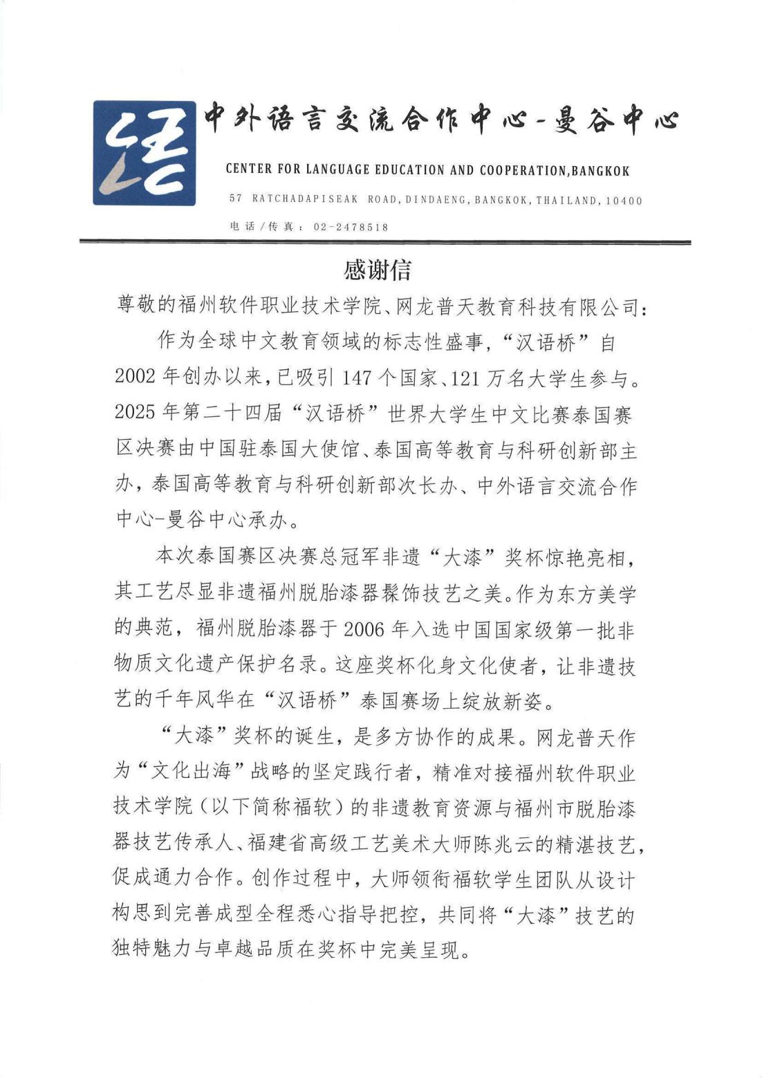 此次活动成果获得主办方高度认可,赛事承办单位—中外语言交流合作中心-曼谷中心特发来感谢信,盛赞非遗“大漆”奖杯为“化身文化使者,让非遗技艺的千年风华在‘汉语桥’泰国赛场上绽放新姿”,并高度肯定了由网龙普天教育精准对接、福软师生团队在陈兆云大师指导下通力协作的校企合作模式,将其誉为“教育力量、企业担当与匠人精神同频共振的硕果”。这封感谢信是对我校非遗教育成果与国际传播能力的有力背书,也为未来深化合作奠定了坚实基础。
